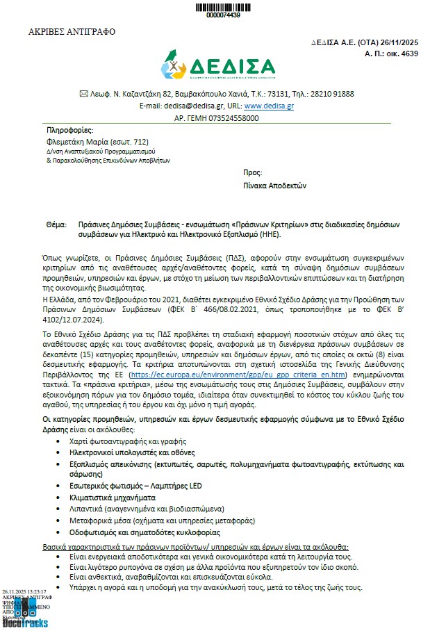 - Αποστολή ενημερωτικού δελτίου στους Δήμους και λοιπές αναθέτουσες αρχές της Π.Ε. Χανίων για την ενσωμάτωση «Πράσινων Κριτηρίων» προμήθειας ΗΗΕ στις Δημόσιες Συμβάσεις.